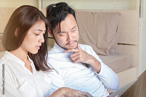 © thaninee, Fototapeta premium Couple is doing business on line from laptop