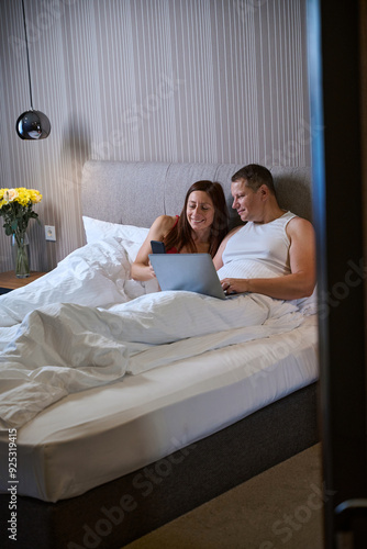 © Viacheslav Yakobchuk, Fototapeta premium Couple is looking at something on the laptop