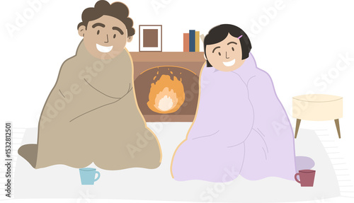 Obraz premium Couple is sitting wrapped in blankets by fireplace on white rug, flat design...