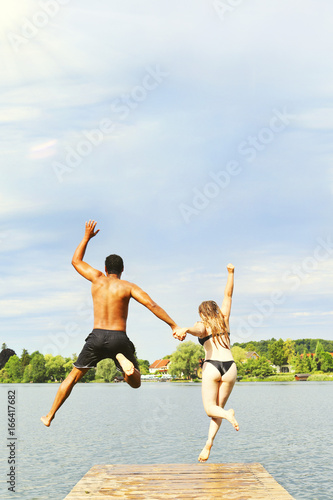 © tiagozr, Obraz premium Couple Jumping Into Lake
