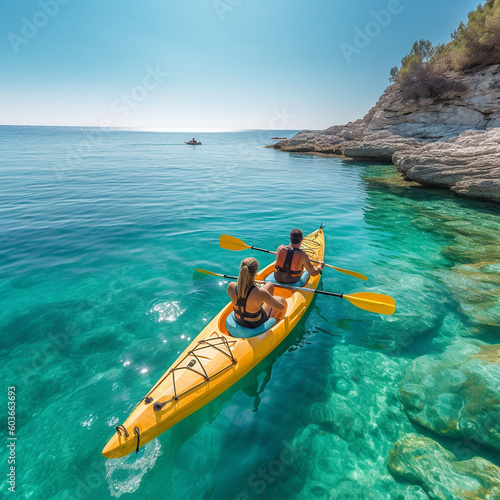© D-stock photo, Fototapeta premium Couple kayaking in blue sea in vacations