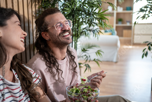 © Migma_Agency, Obraz premium Couple laughing and eating salad at home