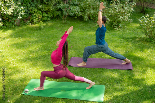 Fototapeta premium couple meditating doing yoga in nature.man and woman doing yoga exercises meditating on green grass