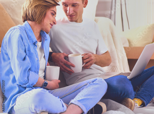 Fototapeta premium Couple moving in together relaxing on sofa couch with laptop tablet computer...