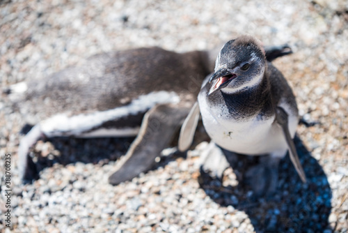 © Martina, Obraz premium Couple of beautiful Penguins dwelling free in a natural national park in north Patagonia near the city of Puerto Madryn in Argentina. Unesco world heritage as natural reserve park in a summer day.