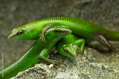 © Dead Tree World, Fototapeta premium couple of green little lizards