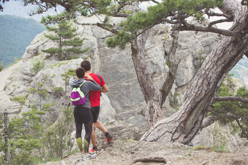 © Kirill Grekov, Naklejka premium Couple of hikers looking from mountain