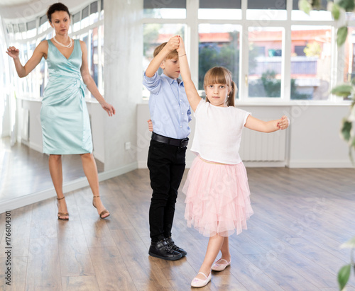 Naklejka premium Couple of positive interested preteen dancers, boy and girl preparing for performance, rehearsing ballroom dance in spacious classroom while female teacher observing from background