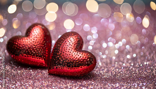 Naklejka premium Couple of red metal hearts an a light pink glitter