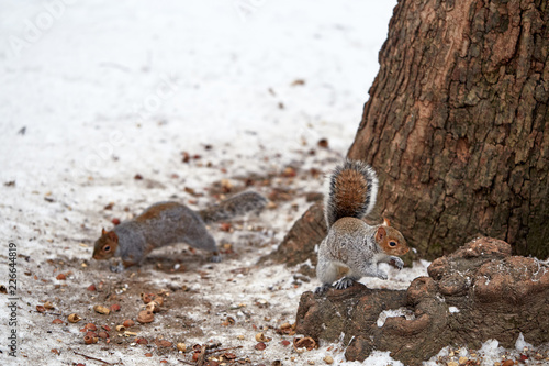 Obraz premium couple of squirrels eating hazelnuts in the snow
