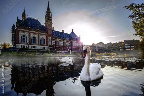 © Ankor light, Naklejka premium Couple of swans swimming on the pond of the Peace Palace