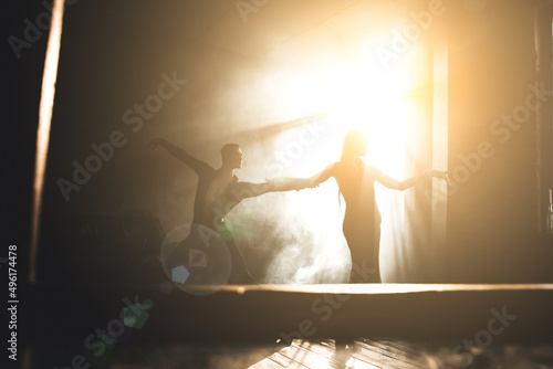 © Vadym, Naklejka premium Couple of two professional ballroom dancers is dancing on loft studio. Beautiful art performance with heavy smoke. Sport life concept. Passion and emotional dance.