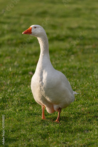 Fototapeta premium couple of white house gooses at green meadow