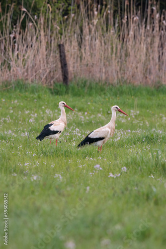 © jibz, Fototapeta premium Couple of white storks wandering in spring flower meadow