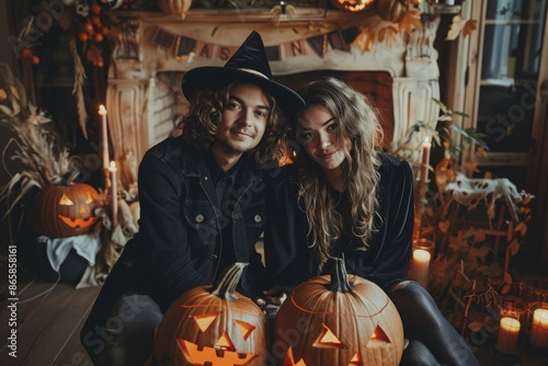 Fototapeta premium Couple Posing With Jack OLanterns In Front Of A Fireplace For Halloween