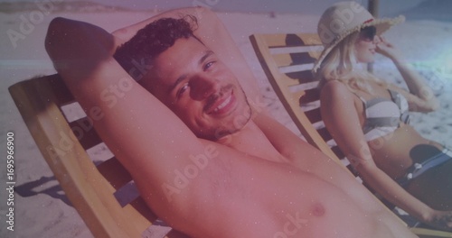 Fototapeta premium Couple reclining on beach loungers at sand dunes, wearing swimwear and straw...