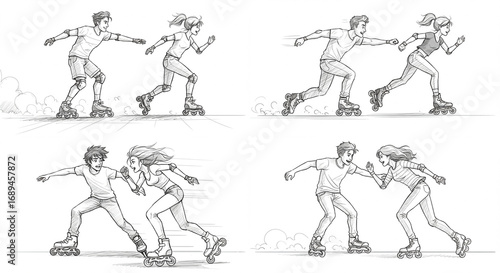 © Svetlana, Fototapeta premium couple rollerblading together isolated on white sketch style