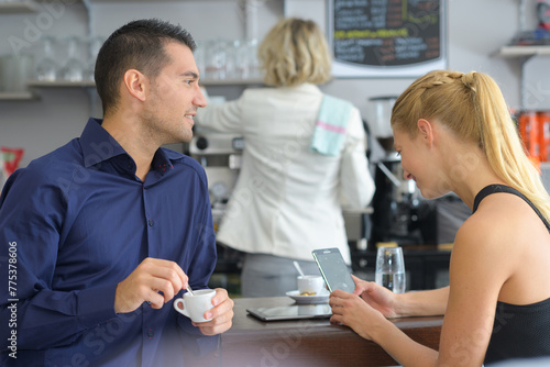 Obraz premium couple sat in cafe woman using smartphone