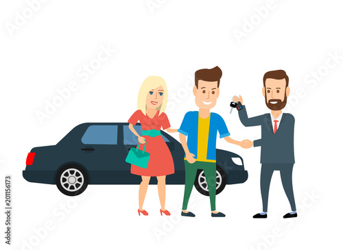 Obraz premium couple shaking hands with dealer. car sale or rent concept