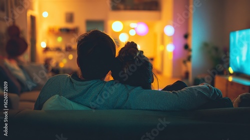 © Sheng, Naklejka premium Couple sharing a cozy moment on sofa, warm lighting highlighting intimate home atmosphere.