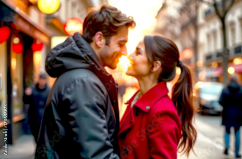 © keleny, Obraz premium Couple sharing a romantic moment on Valentine's Day at sunset in a city street. Blurred picture. Blurred picture