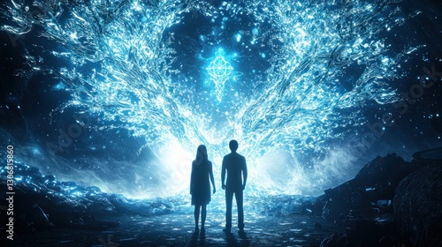 © harryaishi, Fototapeta premium Couple silhouetted against a glowing, icy tree.