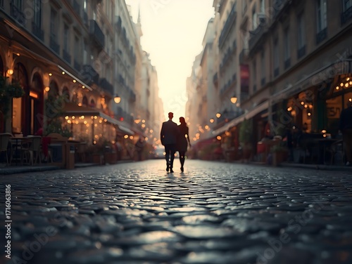 © MdNaiemHossain, Obraz premium Couple silhouetted on cobblestone street at dusk