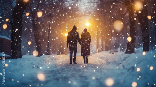 Obraz premium Couple Silhouetted Walking in Snowy Night, Hand in Hand