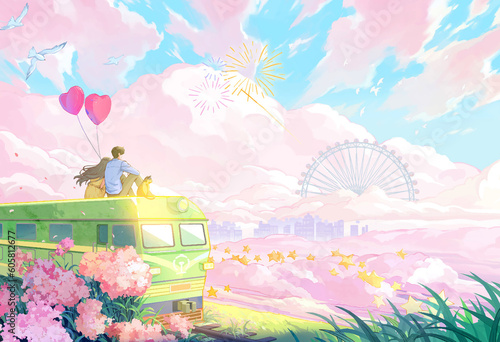 © Diganime, Obraz premium couple sitting on car enjoying landscape beauty