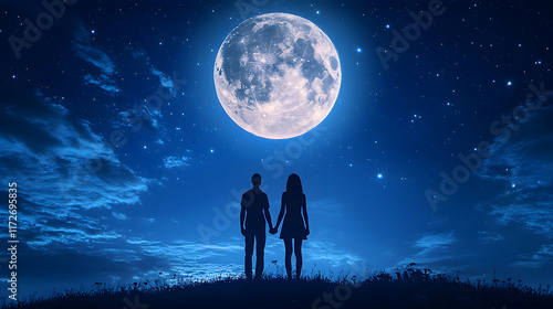 Fototapeta premium couple stands hand in hand under full moon, surrounded by stars, creating...