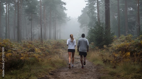 © MANASNAND, Fototapeta premium Couple Training Walk Through Foggy Pine Forest Trail