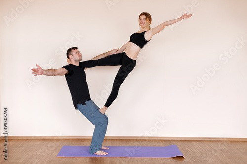 © BartLoveyou, Fototapeta premium Couple trains yoga in the studio