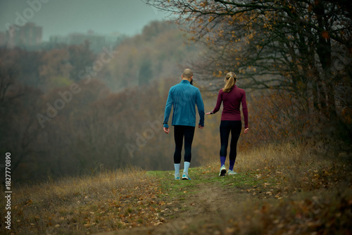 Fototapeta premium Couple walking cool-down path in misty autumn forest after trail run. Concept...