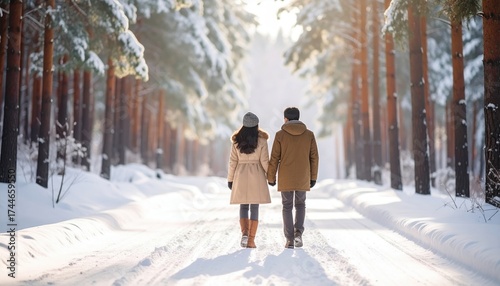 Naklejka premium Couple walking hand in hand through a snowy forest path, surrounded by tall pine trees and soft sunlight