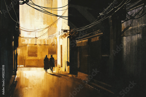 © grandfailure, Obraz premium couple walking in alley at night,illustration painting