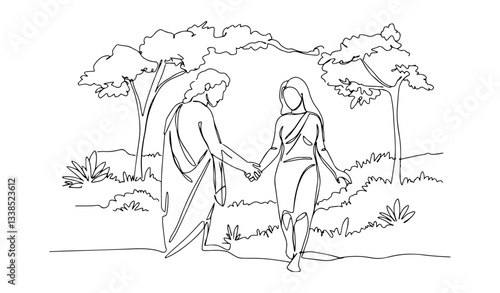© Wieslaw, Obraz premium couple walking in nature outline one line vector shape