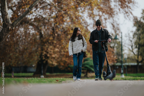 © qunica.com, Fototapeta premium Couple walks together in a park during autumn. The man rides a scooter while the woman strolls beside him on a leaf-strewn path.