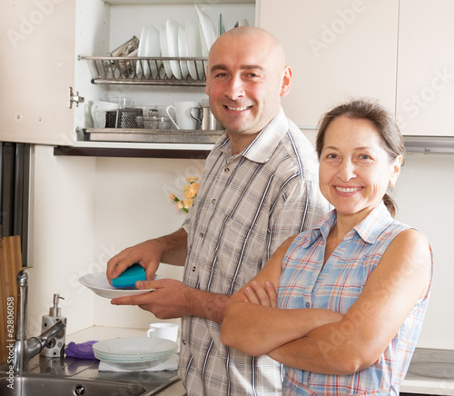 Obraz premium Couple washing plates in home kitchen