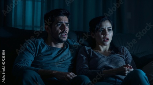 Obraz premium Couple watching a movie together with suspenseful expressions