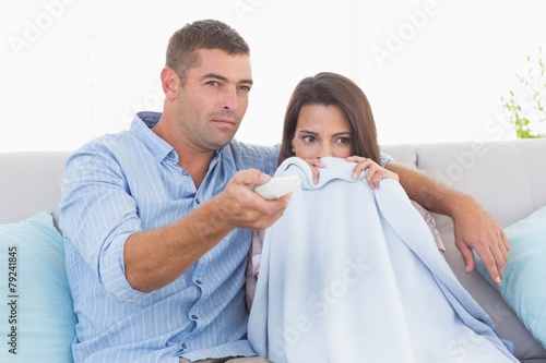© WavebreakmediaMicro, Obraz premium Couple watching horror movie on sofa