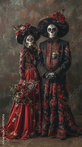 © Maria Vitkovska, Fototapeta premium Couple wearing calavera makeup for day of the dead posing in studio
