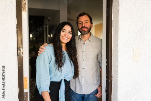 © AntonioDiaz, Naklejka premium Couple welcoming guests at front door, smiling happy at apartment entrance, husband and wife standing together at home