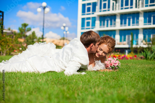 © A.Kazak, Naklejka premium couple with bouquet posing in park lying on the green grass
