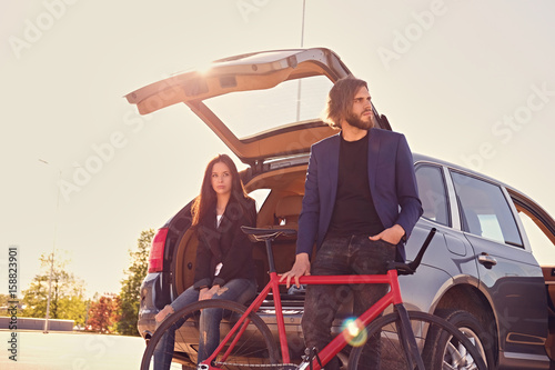 Obraz premium Couple with single speed bicycle near the car with open trunk.