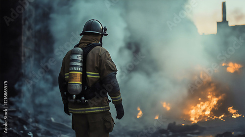 © Stefan, Fototapeta premium Courageous Firefighter Battling Flames in Smoke-Filled Environment During Rescue Operation
