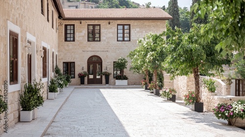 © MAKASIHMAS SIDNEY, Fototapeta premium Courtyard of historic stone building, sunny day, hillside background, tourism