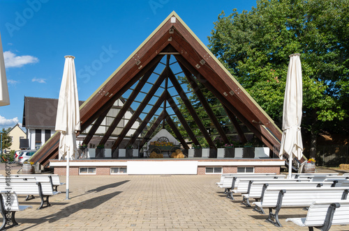 Obraz premium Covered open-air stage with white benches in Burg, Spreewald, Germany. A...
