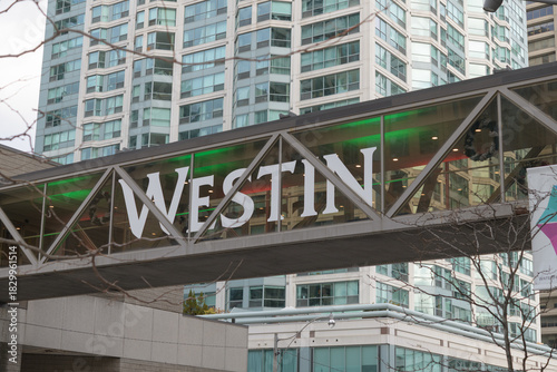 Obraz premium covered pedestrian walk with sign at The Westin Harbour Castle, a four-star hotel, located at 1 Harbour Square on Queens Quay W, Toronto