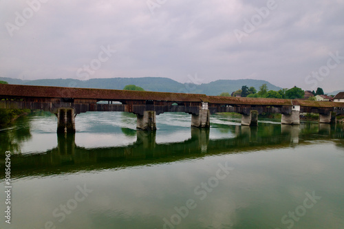 Fototapeta premium Covered wooden bridge over the Rhine River at Stein, Canton Aargau, and Bad...