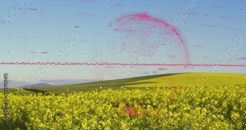 © vectorfusionart, Fototapeta premium Covering farmland, yellow flowering crops extending toward green hills, with red data overlay